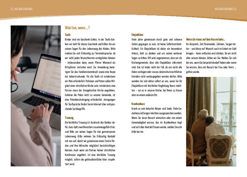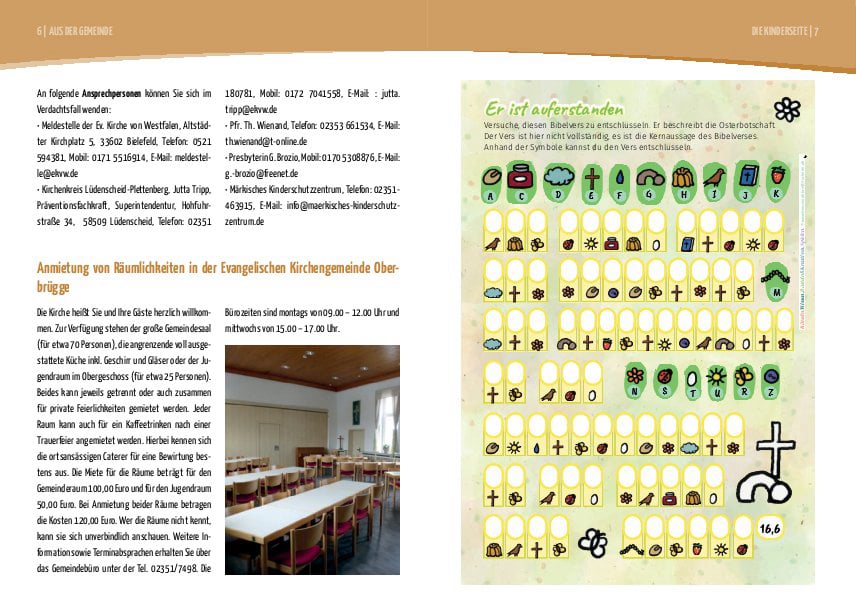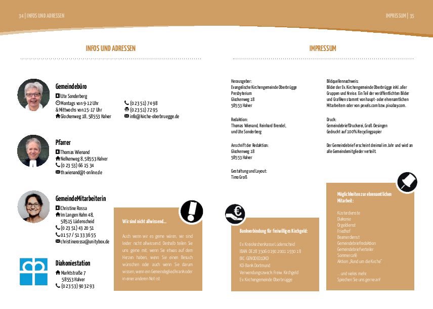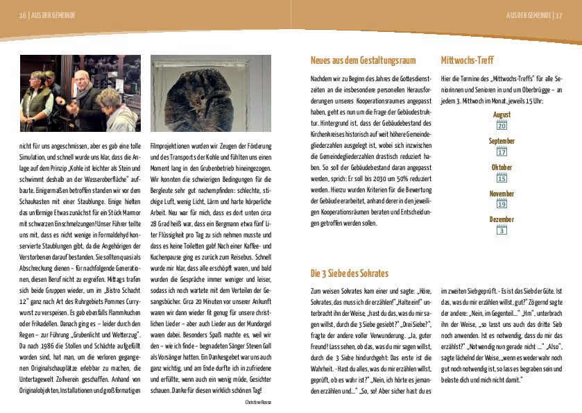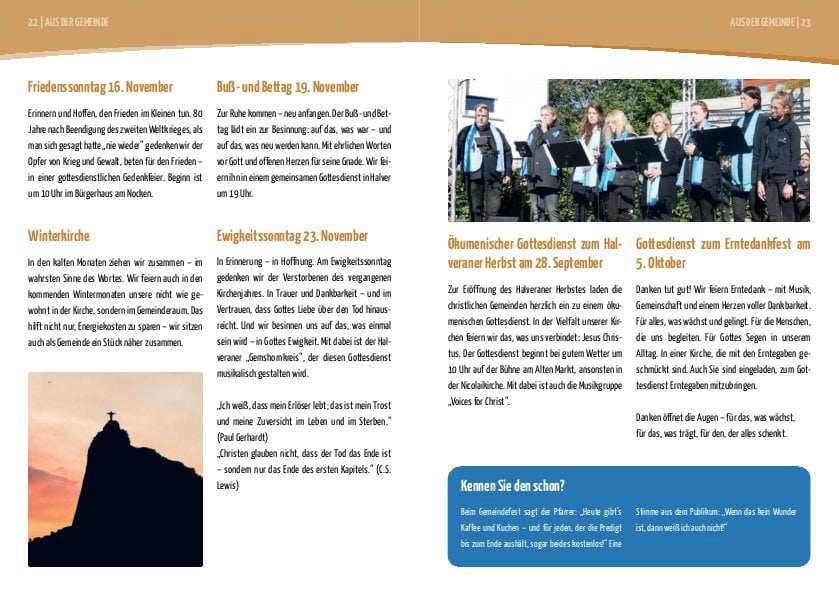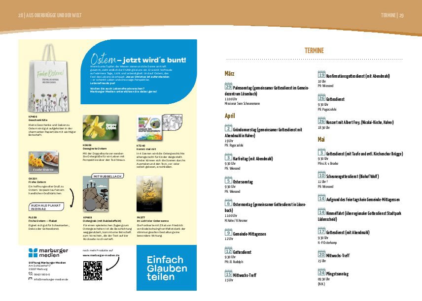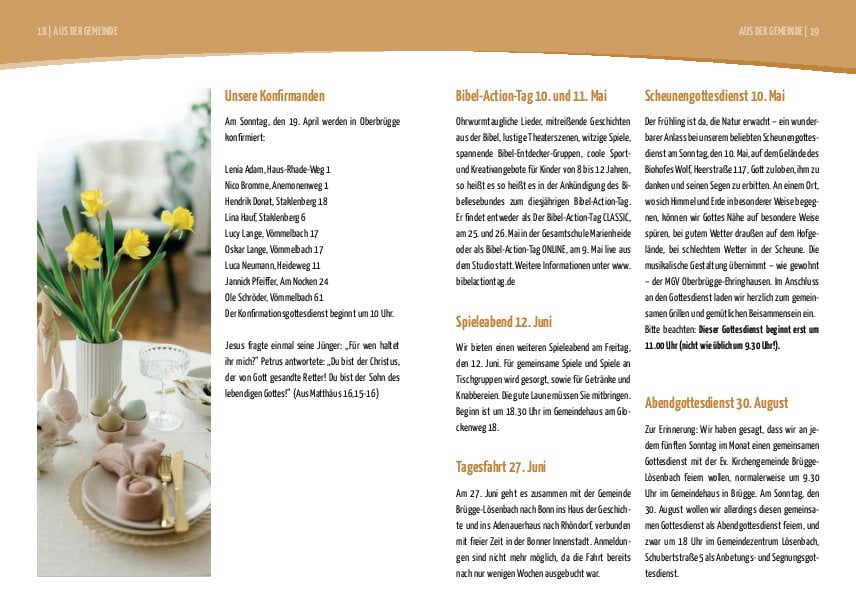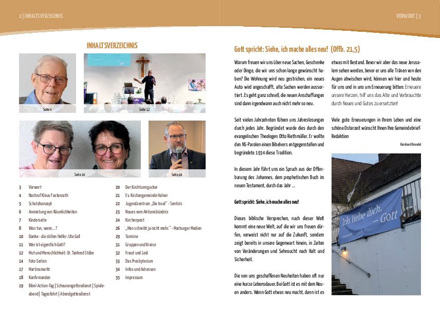Dreimal im Jahr erscheint unser Gemeindebrief. Wenigstens, wen alles glatt läuft. Er wird im Ort verteilt und an entfernt lebende Mitglieder verschickt. Online kann man ihn hier lesen.